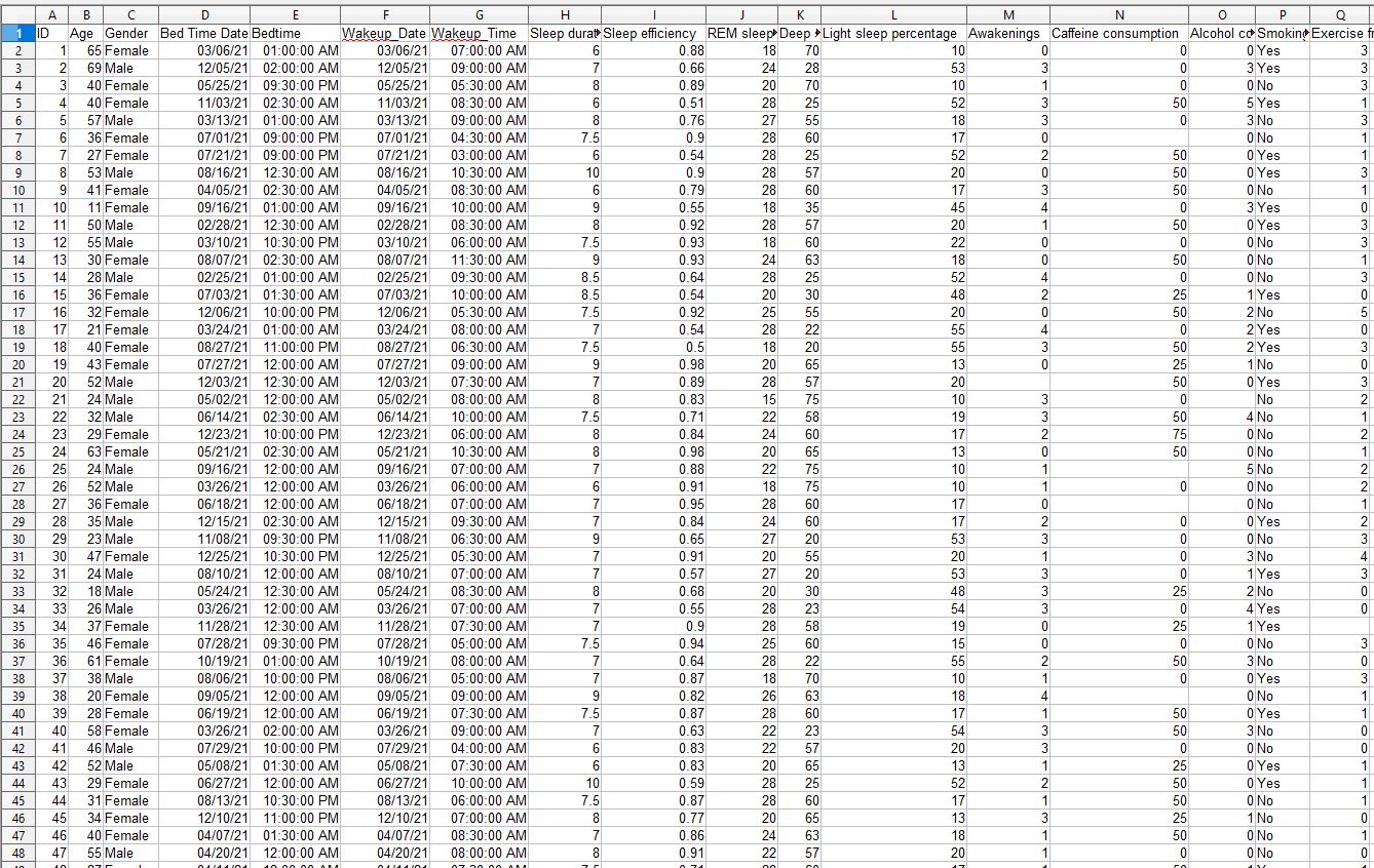 In order to get more experience with spreadsheets, I decided to experiment with some databases I found on Kaggle, specifically a database on the results of a sleep survey and a general finance database: