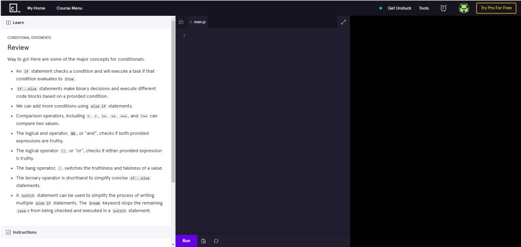 Most of the codecademy looks similar to the picture above. Instructions were given in the white box, The purple box contained code that the user could write or edit and the black box shows the output.